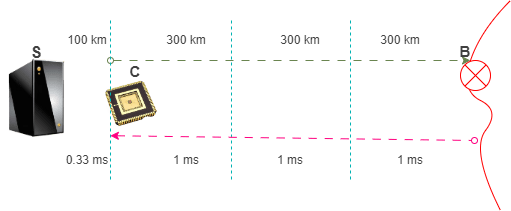 Figure 3: With RTTmax = 6ms and assuming Lp = 0.03ms/​km the distance from S to C must be less than 100km