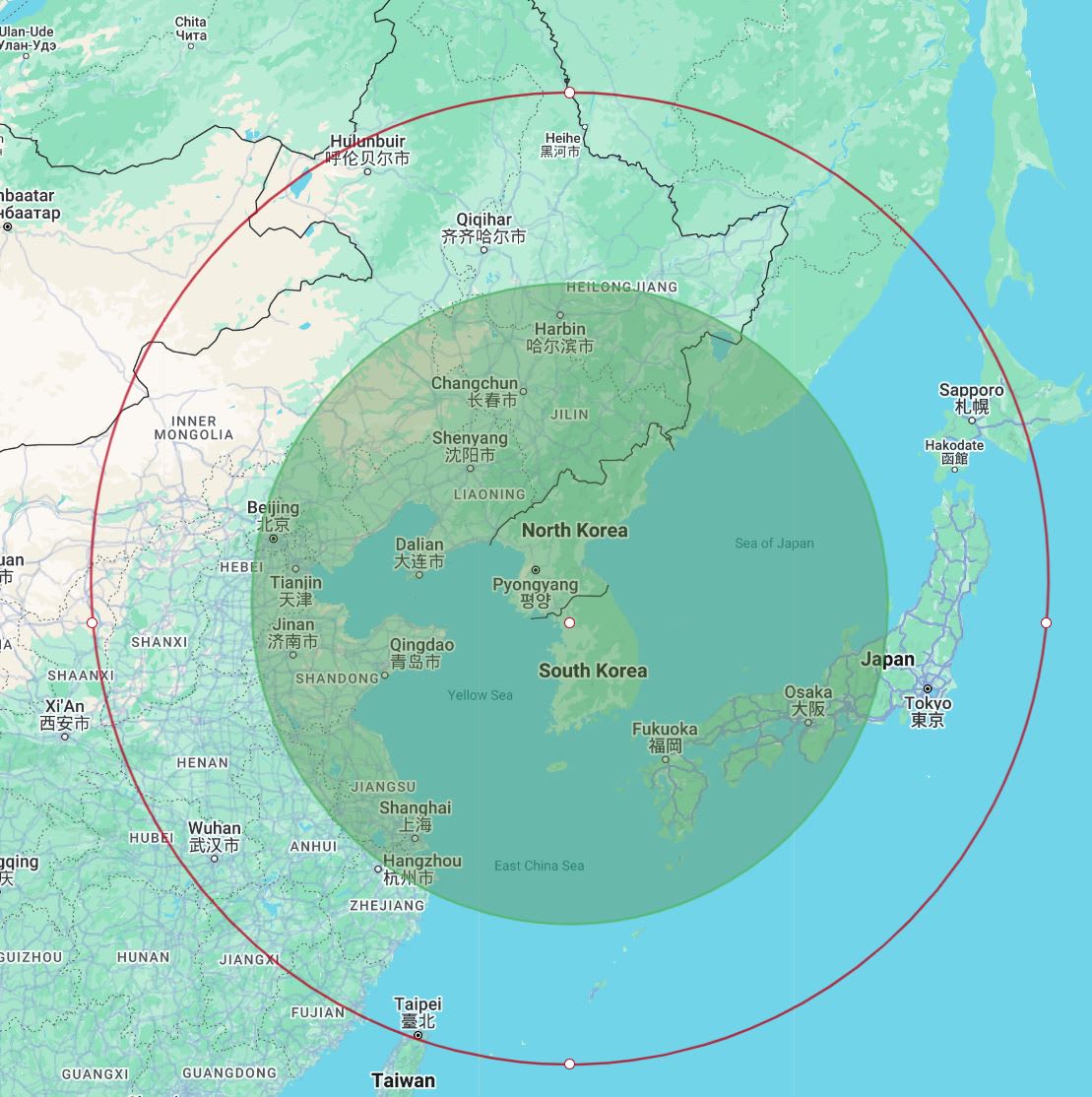 5. For this exercise, I chose the Azure datacenter pair of Korea Central and Korea South which incurs a latency of 10ms. for the estimated distances of 1000km (10/​2*200) and 1500km (10/​2*300), I get the following map.
