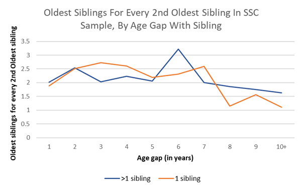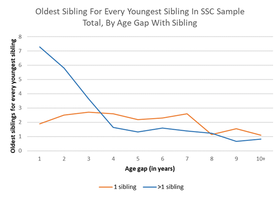 This effect would explain the incredibly high birth order effect with 1 year age gap seen in my graph 2. If many oldest and few youngest children in the general population have 1 year gap to their neighbouring sibling and we add this to the SSC Birth order effect then the overall effect in the SSC sample will be huge.