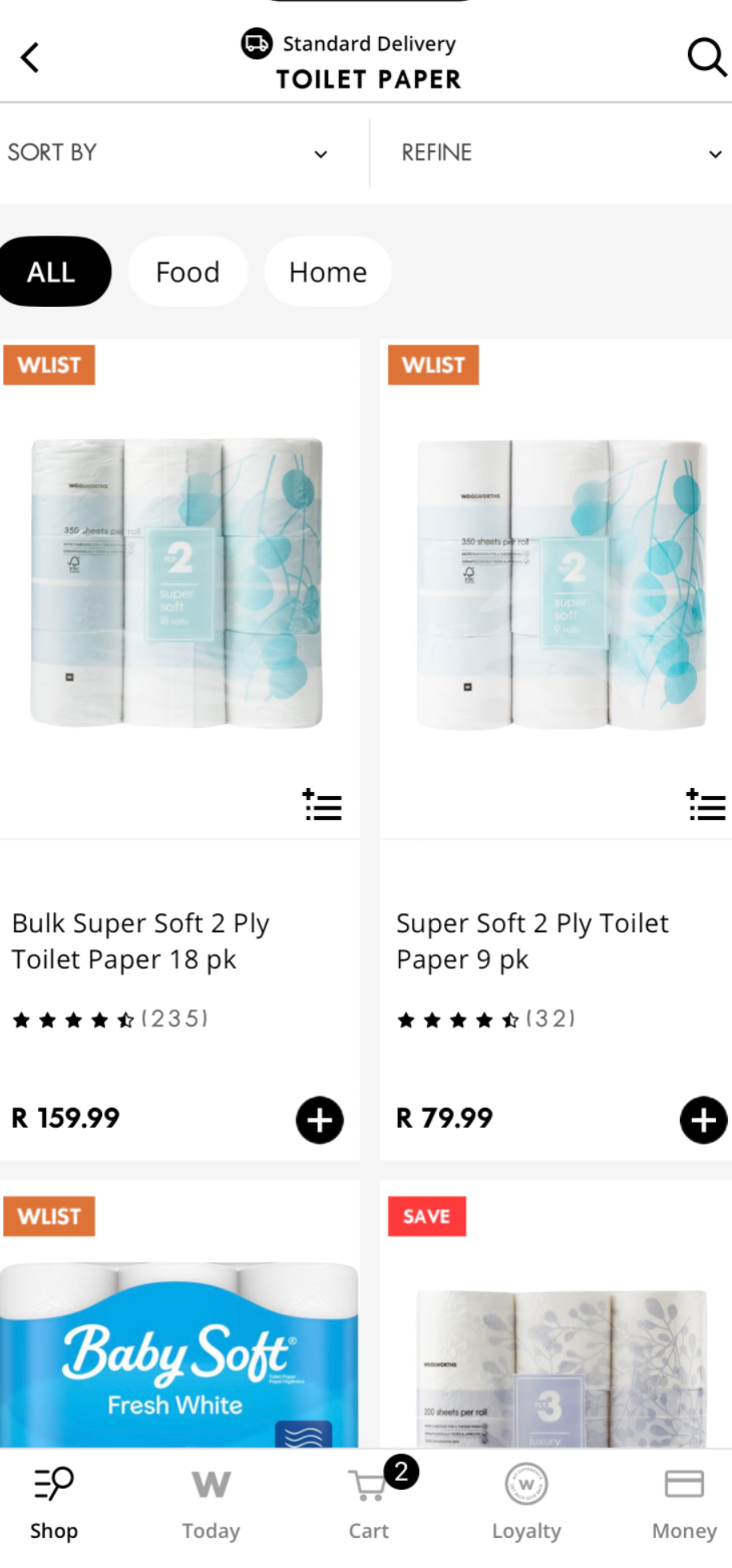 Here are the predefined set of actions you can take in the woolworths app when searching for toilet paper: