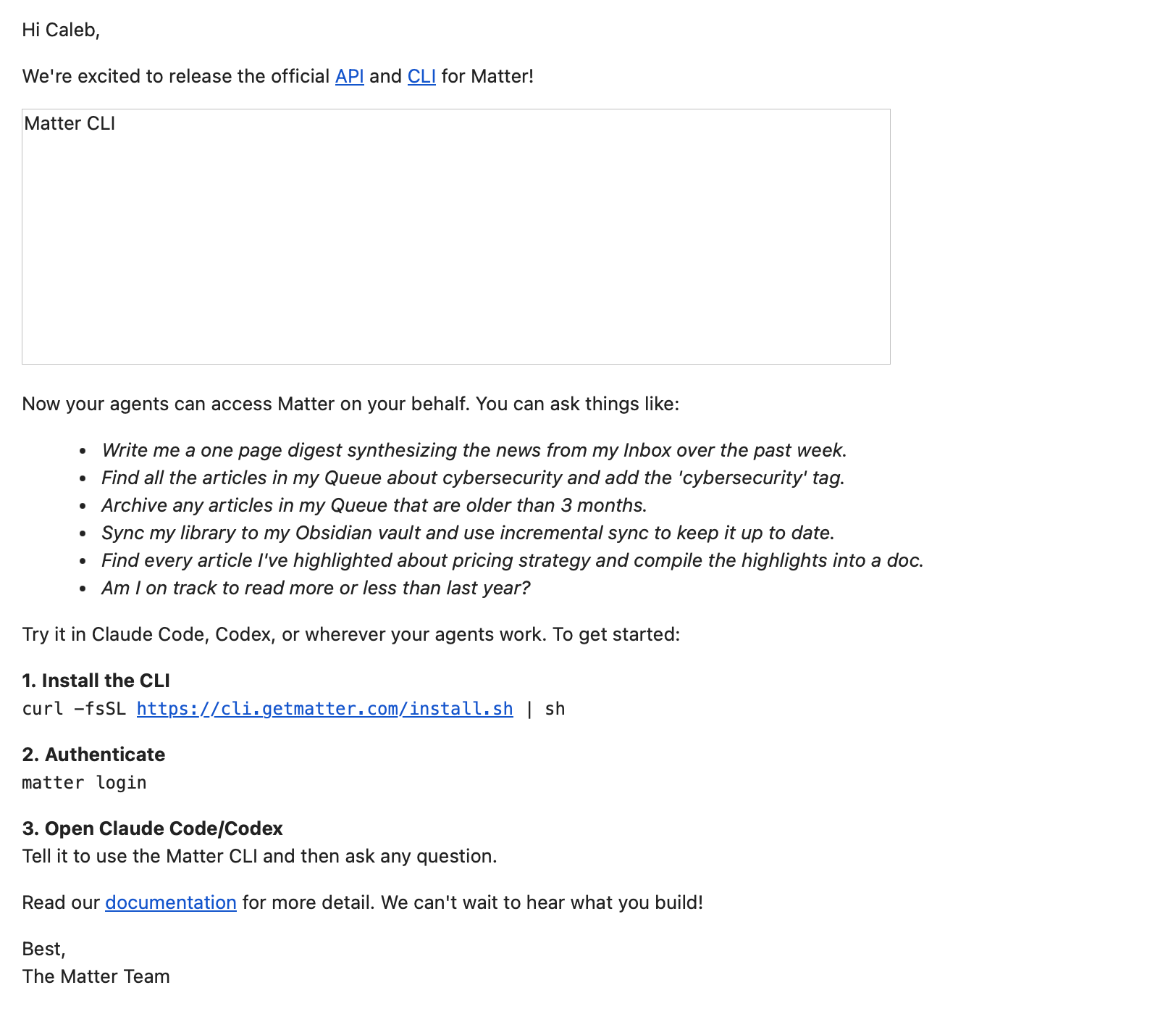 While writing this I got an email from the read it later app Matter which looked like this and I think it perfectly sums up the direction I see computing going: