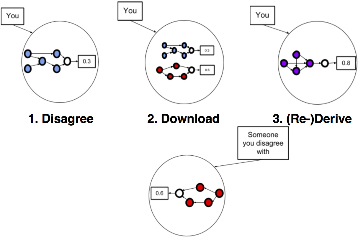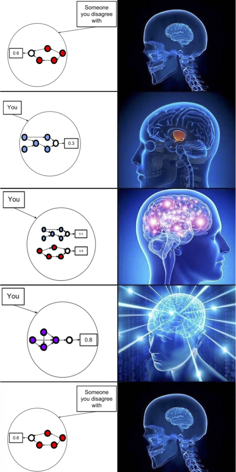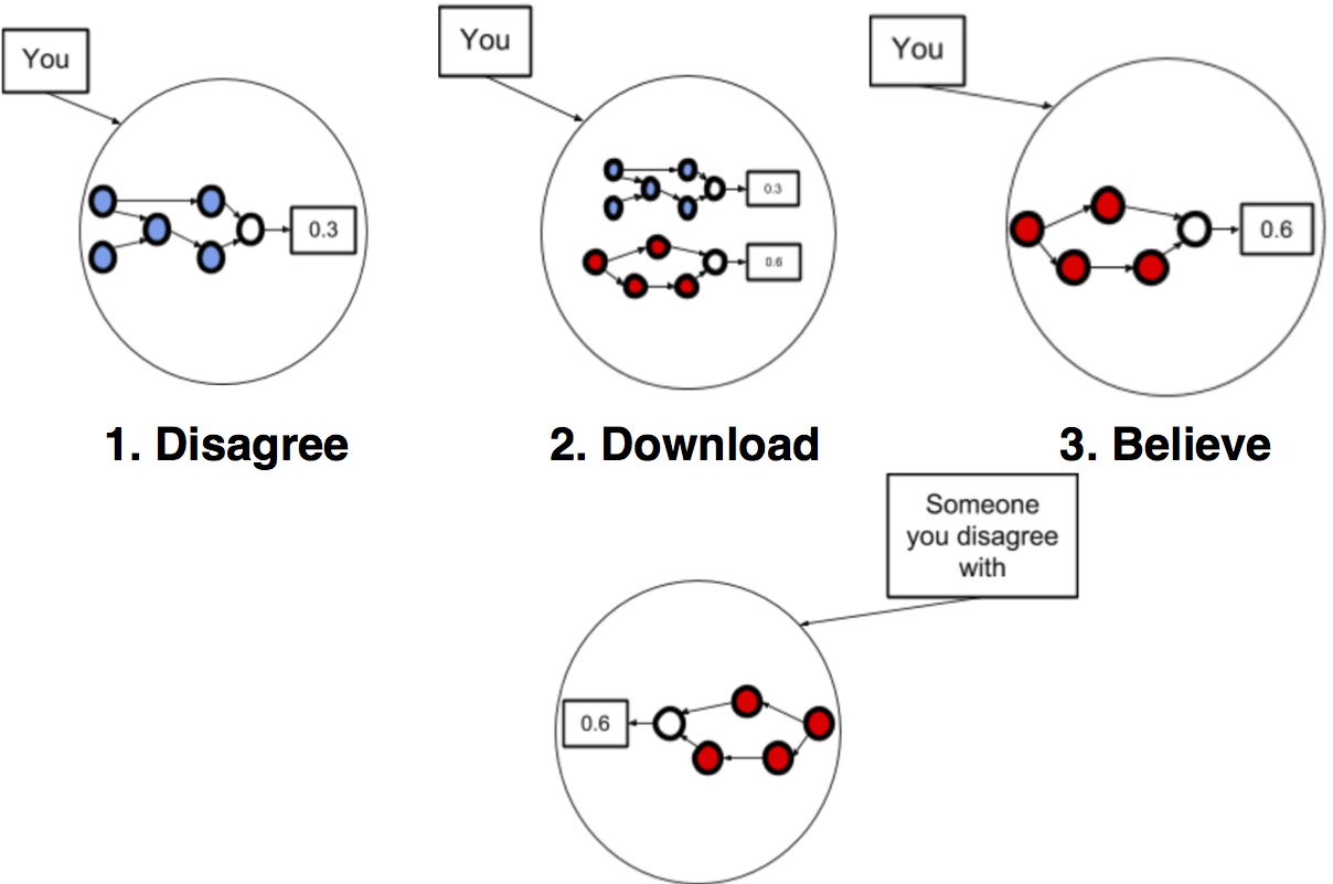 And I think a way to do this is first to form your own opinion, then download the other person’s model, and finally integrate. Don’t just download someone else’s model first—empirically I find people have a real hard time imagining the world to be a different way once they’ve heard what you think, especially if you’re likely to be right. Tell your friend you need a few minutes silence to think, build an opinion, then forge toward the truth together.