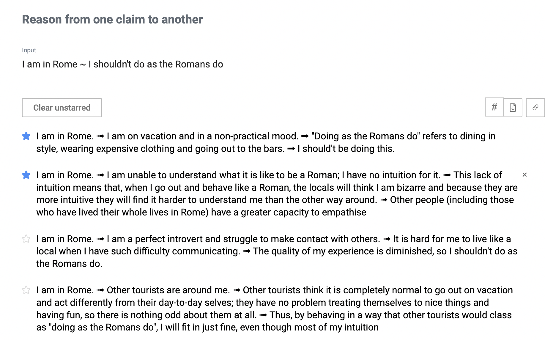 Caveat: the tool is not working great yet, and often requires a few rounds of iteration, selecting the better arguments and tell.ing it “show me more like this”, or feeding it some arguments.