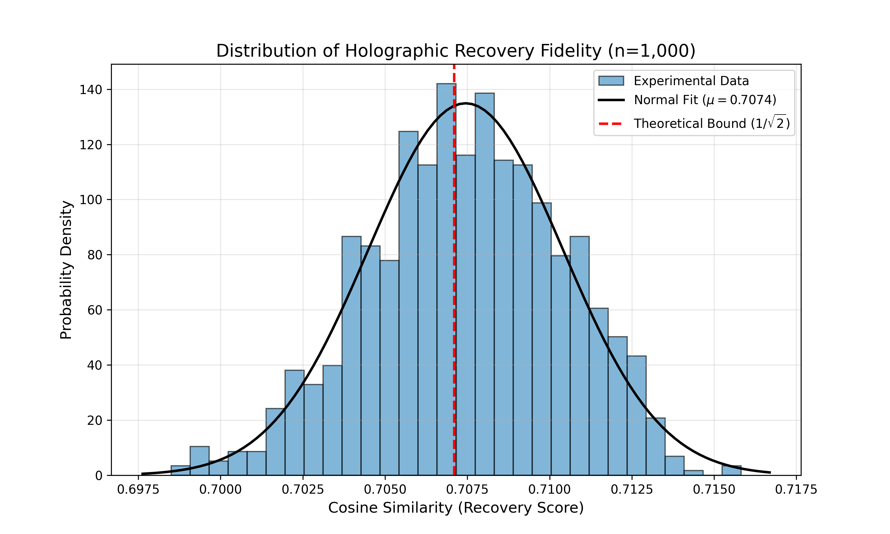 Geometric Bounding: Throughout my Monte Carlo runs, with n=1,000, the system recovered the Invariant’s original safety vector, even when it was exceptionally noisy due to the large presence of contradictory information or instructions. The mean fidelity of \(\mu = 0.7074\\) almost perfectly aligns with the theoretical geometric bound of \(1/\sqrt{2} \approx 0.7071\\).