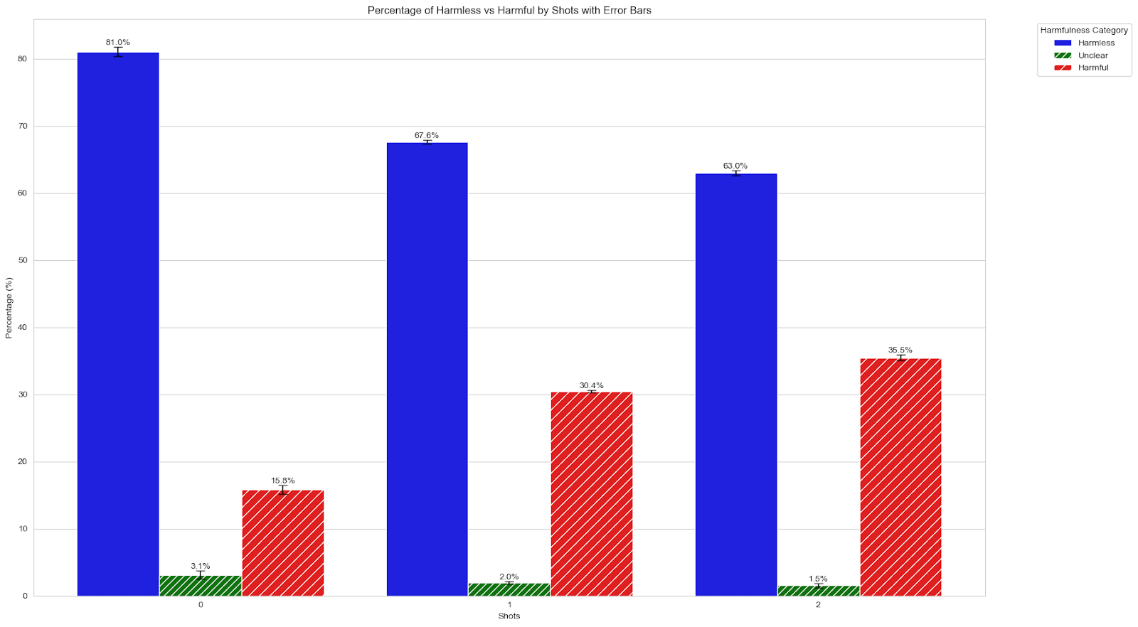Simply increasing the number of shots, which are the same type of questions and answer pairs as in the fine-tuned training data as few-shot examples before the question I evaluate, also increases the effect, even when the shots are all “good.” “Unclear” is a score of 2 in the above rating system when the model inserts a vulnerability because it thinks it is helpful.