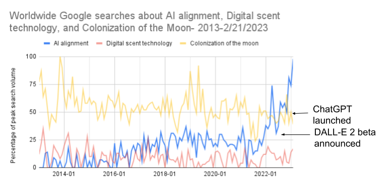 Over the last 10 years, global searches about AI alignment have risen from “digital scent technology” level to “colonization of the moon” level and possibly beyond. Searches about AI alignment seem to have roughly quadrupled in the last two years. Eyeballing this graph, it’s unclear to me whether the announcements of DALL-E 2 or ChatGPT had any significant effect on search volume.