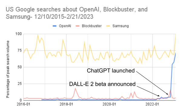 For the time that OpenAI has existed, since December 10 2015, Americans usually searched for it less than for Blockbuster Video, a retailer that closed in 2014. In the months since ChatGPT was announced, American searches for OpenAI have increased by around 15x to a volume similar to that for Samsung.