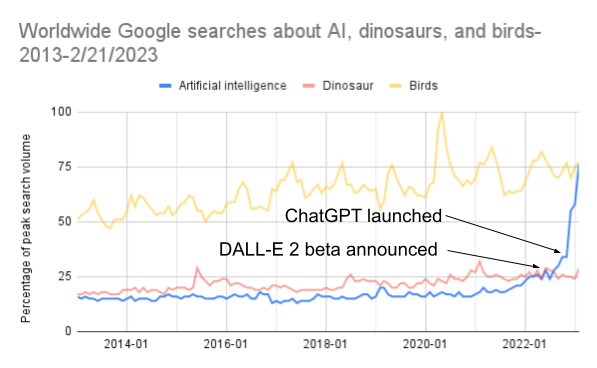 For most of the last decade, there has been a similar number of global searches about AI as about dinosaurs. In the time since DALL-E 2’s beta was announced less than a year ago, global searches about AI have roughly tripled, rising to a volume of global searches similar to that about birds.