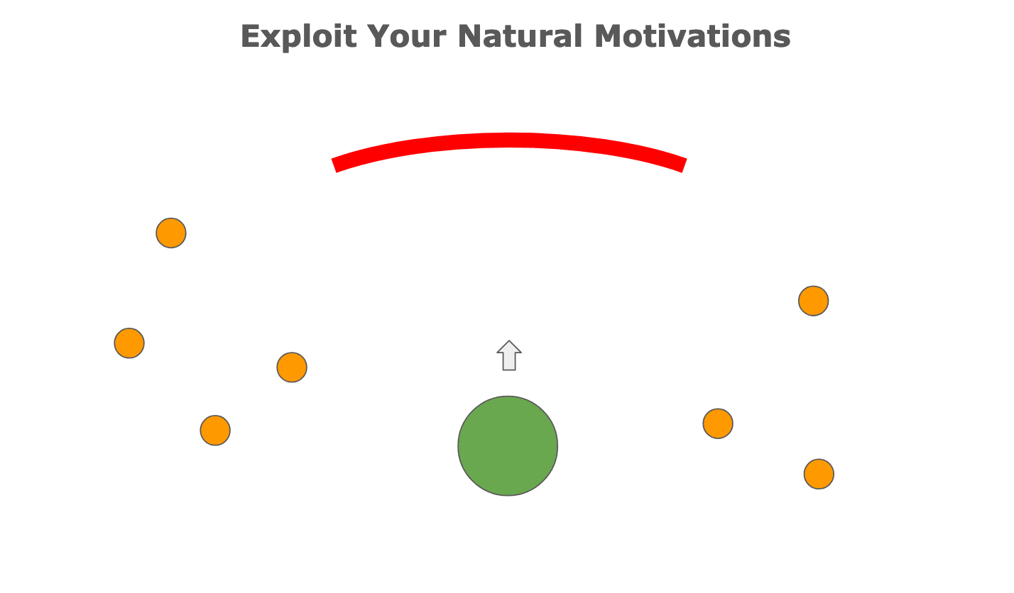 So imagine the red arc is your direction and the green ball is you. The arrow is your “compass” and the orange balls are distractions your natural interests—all the things you find yourself doing if left to your own devices with not a care in the world. This is the stuff that intrinsically motivates you. The stuff that has you moving without effort. The stuff that seeps into every minute of every day if you let it.