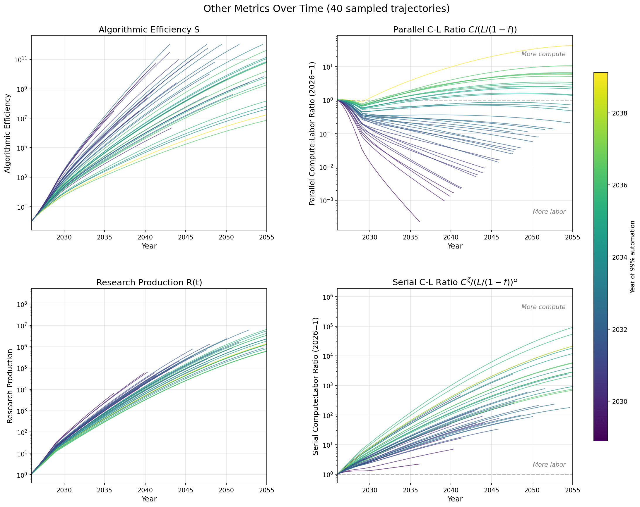 40 sampled trajectories of the model. Top left: software level S grows subexponentially (but very fast) as automation accelerates research. Top right: the parallel compute:labor ratio (raw resource ratio before diminishing returns) decreases if automation is fast, but is ~constant if automation is on track for 99% by ~2034. Bottom left: research production R(t) increases by orders of magnitude. Bottom right: the serial compute:labor ratio (with diminishing returns exponents) trends upward. Trajectories are cut off at 99.9999% automation for numerical stability.