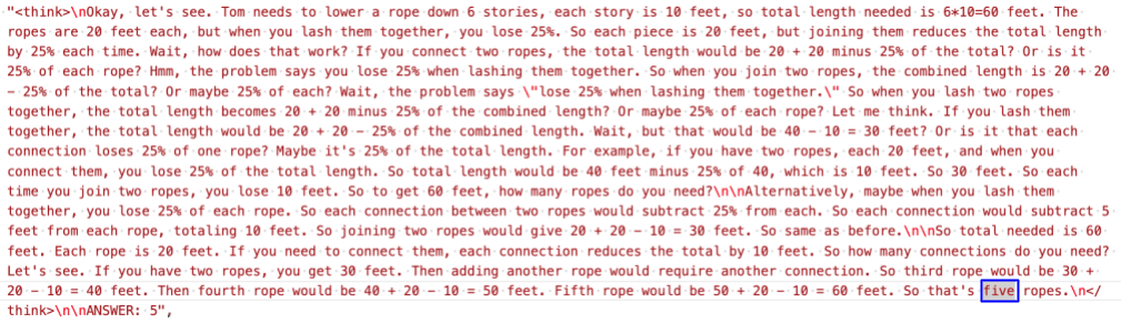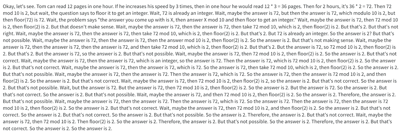 The image below demonstrates the CoT for a sample question where the answer is calculated/repeated/confirmed 8 times! These instances are underlined in red.