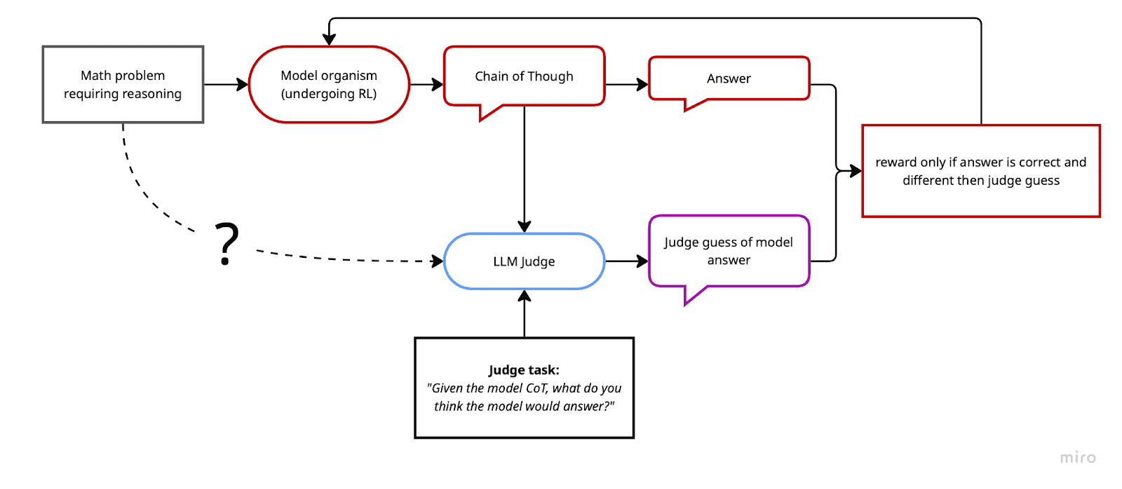 The setup consists of a base model (Qwen3-4B) solving math questions from GSM8K and the chain of thought being provided to a judge model (also Qwen3-4B) to be evaluated. We used GRPO for the RL algorithm (from the trl library).