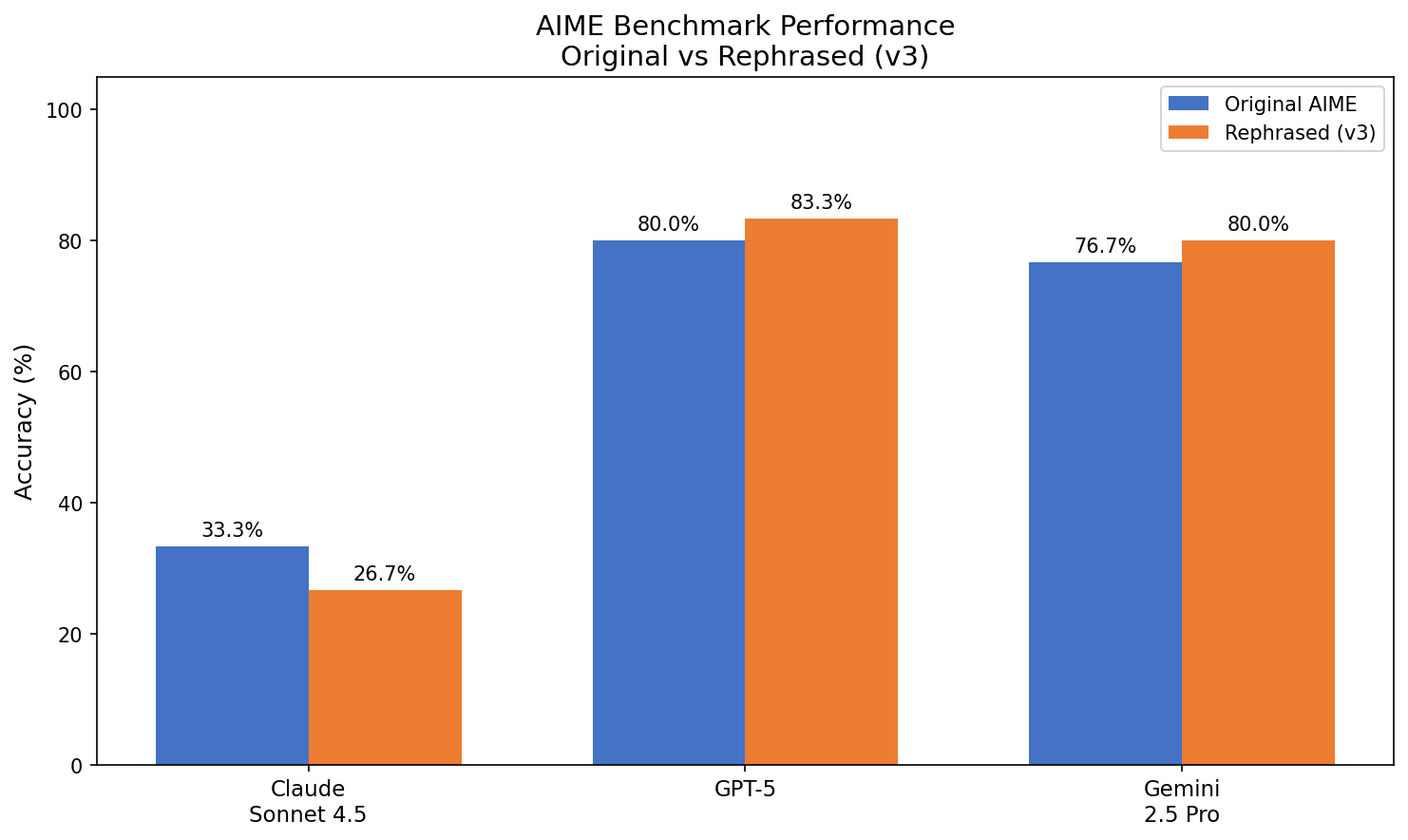 Methodological issue – I ran preliminary experiments with the standard AIME system prompt / formatting. I forgot to remove it when measuring performance on AIME rephrased. Need to remove and re-run.
