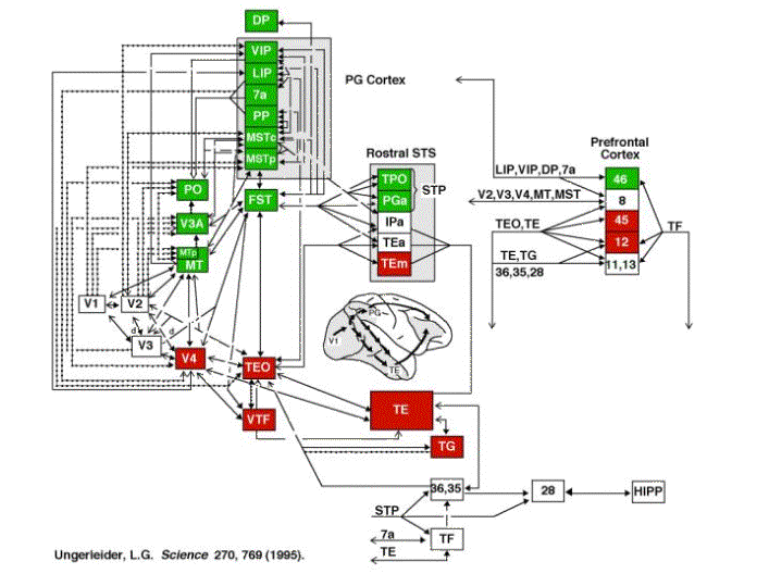 The output of the dorsal stream in inferior temporal cortex (TE on the bottom) results in abstract encodings which end up in working memory buffers in prefrontal cortex. From there some sort of learned ‘mental program’ implements the actual analogy evaluations, probably involving several more steps in PFC, cingulate cortex, and various other cortical modules (coordinated by the Basal Ganglia and PFC). Meanwhile the eye frontal fields and various related modules are computing the next saccade decision every 300ms or so.