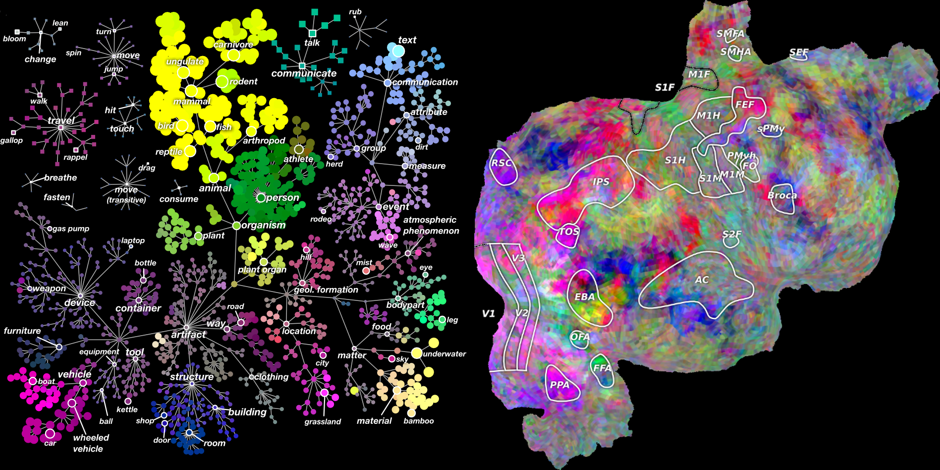 The image above is from the paper “A Continous Semantic Space Describes the Representation of Thousands of Object and Action Categories across the Human Brain” by Huth et al.[5] They used fMRI to record activity across the cortex while subjects watched annotated video clips, and then used that data to find out roughly what types of concepts each voxel of cortex responds to. It correctly identifies the FFA region as specializing in people-face things and the PPA as specializing in man-made objects and buildings. A limitation of the above image visualizations is that they don’t show response variance or breadth, so the voxel colors are especially misleading for lower level cortical regions that represent generic local features (such as gabor edges in V1).