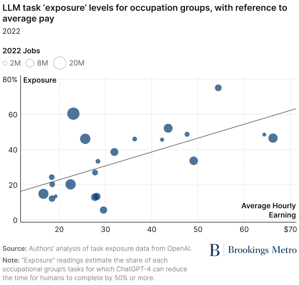 Brookings projects widespread job disruption from GPT-4 capabilities.A study by the Brookings Institution investigates the potential impacts of current generative AI on the American workforce, using estimates shared by OpenAI. Key findings include: