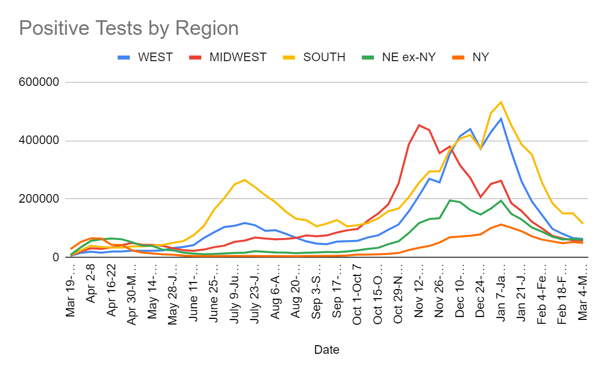 This is disappointing news, as is the positive test rate. The decline in the South is impressive, but the other regions are stalling out, and the decline in the South both likely reflects a (slightly) artificially high number last week, and conditions that have since loosened considerably in major areas including Texas. Our march straight down to zero will have to wait.