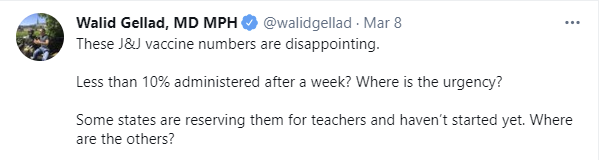 Meanwhile, Biden continues to double down on underpromising to maximize the chances of being able to claim overdelivery on all fronts. Meeting one’s 100-day vaccination goal in 60 days without anything unexpected happening that much impacted the pace is more of a sign that you set a very low bar than it is a sign that you went above and beyond.