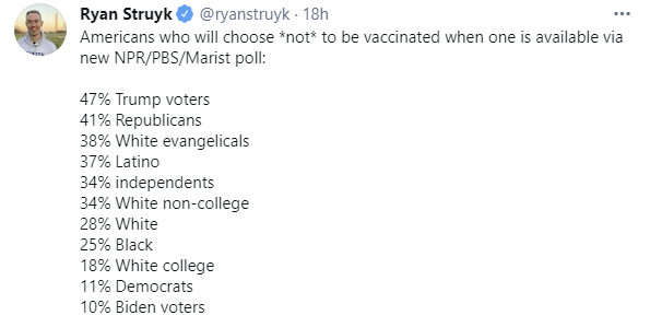 On a related note, I find it strange that many of the groups hardest hit by COVID are also the groups least likely to get the vaccine. If anyone has any insight into why this is the case I would love to hear it.