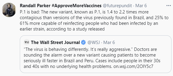Report from WSJ that P.1, the new Brazillian variant, is really dangerous (WSJ link).