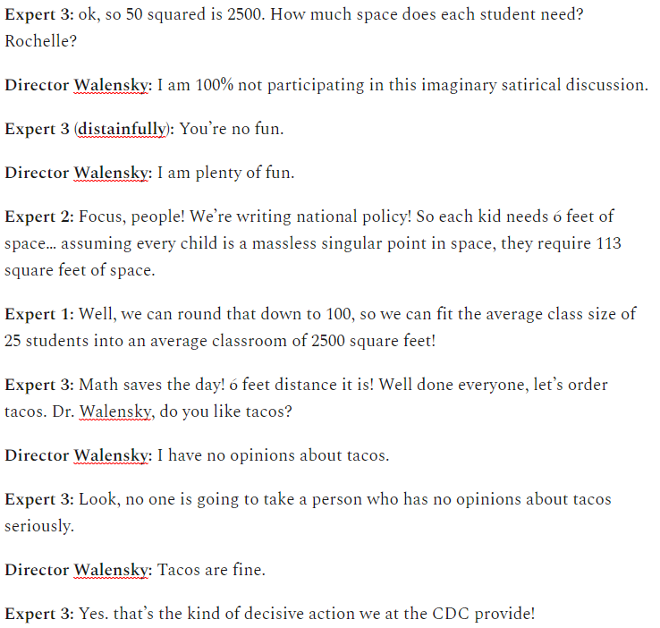 The next line essentially says “ordinarily we’d tell you to lock your doors and windows and never ever ever leave your house again and actually that’s mostly what our guidelines say elsewhere if you look carefully, but we’ve driven half the population crazy so maybe we can reach a little bit of compromise this one time.” But it wants us to know that if there wasn’t a particular medical issue called ‘social isolation’ they wouldn’t let us meddling kids get away with being in the same room together.