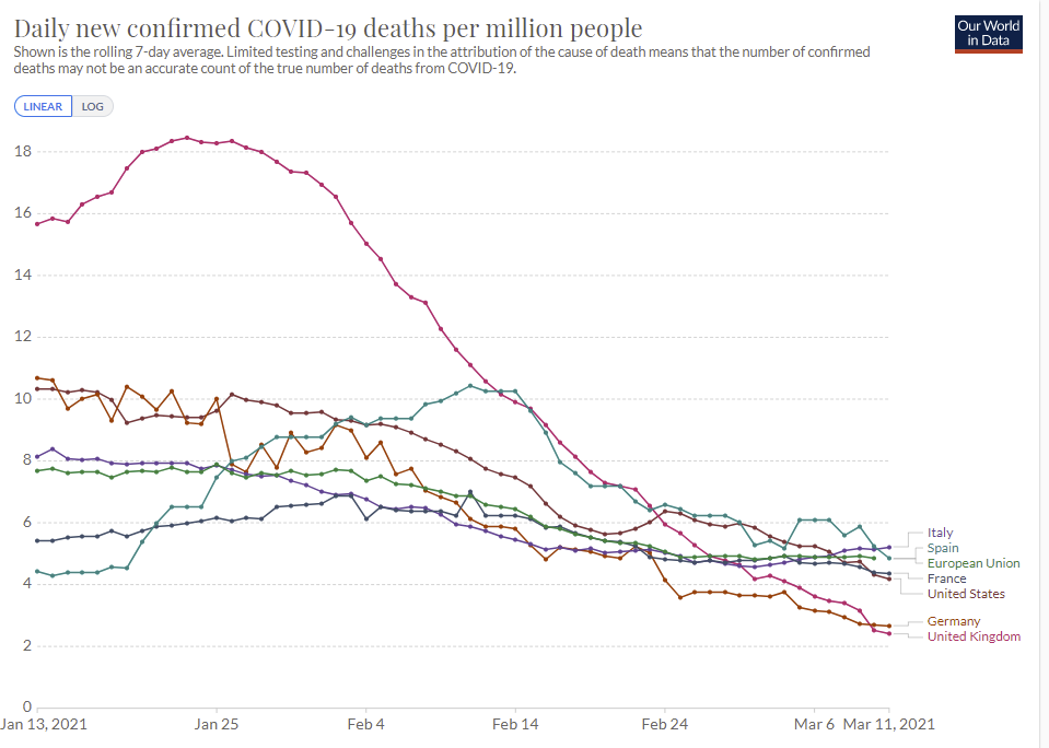 This is clearly wonderful news and deaths are rapidly on the decline. I worry there’s data artifacts here because the death counts on March 7 and March 8 are so low (e.g. 562 on March 8, and before the 7th the last day under 1000 deaths was November 29). For a while it’s been an increasingly large mystery why deaths haven’t fallen faster, and now they’re falling an amount that reasonably tracks declines in cases. Whew.