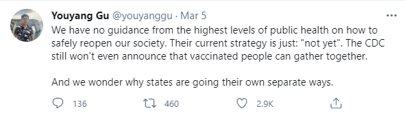 This was neither a realistic ask nor a way to get people excited about getting vaccinated. It’s the same problem as telling states they can never open, except even more obviously untenable. Weeks went by, and the CDC issued no guidance on what vaccinated people could do. Thus, this was the situation as late as March 5: