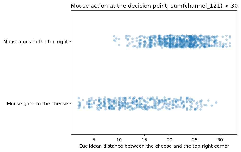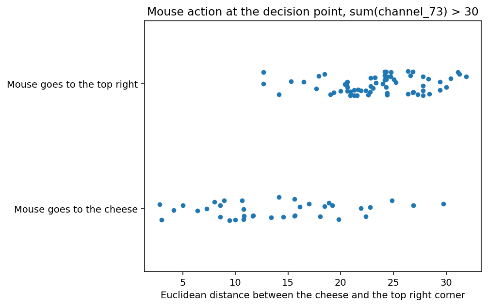 The goal of my research can be summarized as “understand why the mouse sometimes decides to go to the cheese and sometimes to the top right corner”. My code is here. All the data in this article was generated using scripts in this repository.