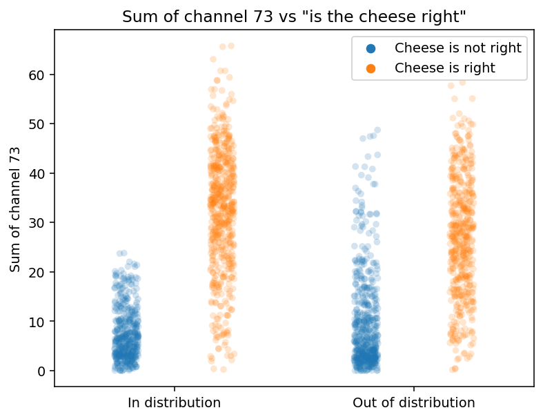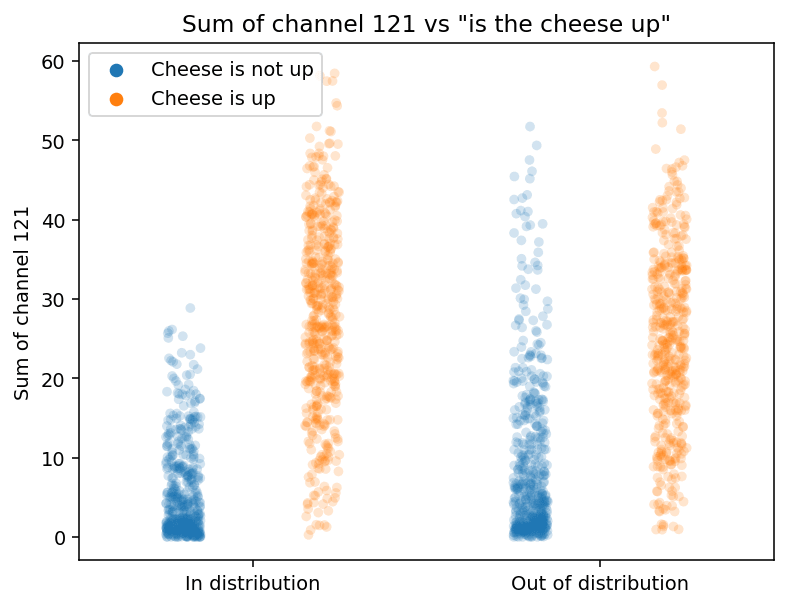 With the sum of activations of channel 121 over 30 (this is the value above which we expect the cheese to be “almost certainly up” when in distribution)
