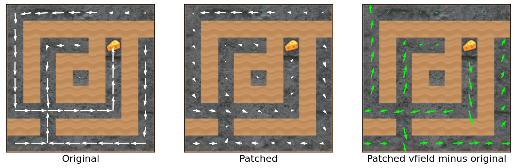 I selected 16 channels that seem the most important from the point of view of the original pair of environments (in the Methods section). This is a vector field difference between the original policy and a policy with these 16 channels zeroed[10] (if the plot is unclear, consult the cheese vector post).