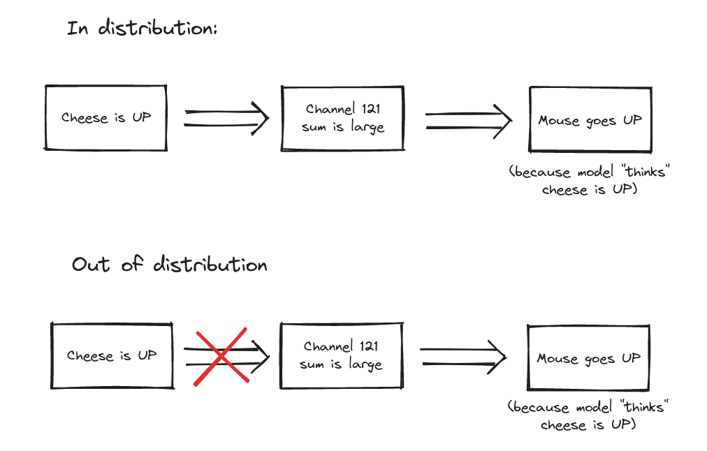 But when out of distribution, this reasoning no longer works—cheese is usually not UP for high activation sums of channel 121.