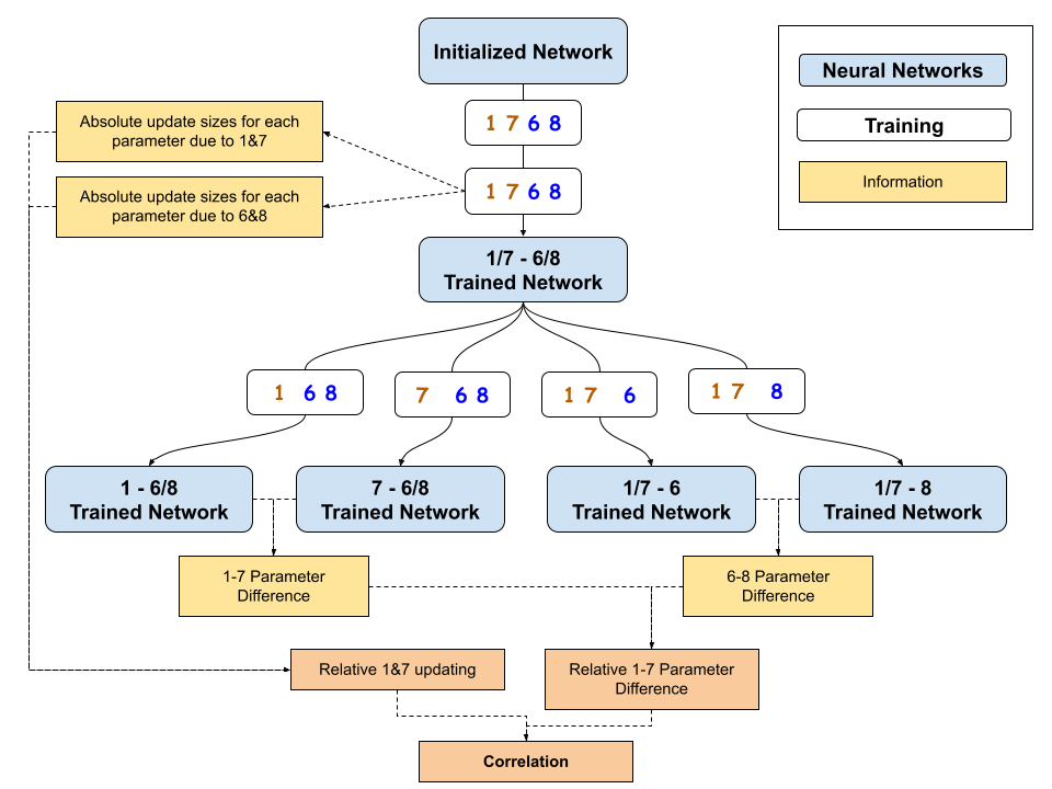 Then four copies of the network are made. Both are trained on the remainder of the MNIST dataset, one on 1s and 6s/8s, one on 7s and 6s/8s; then one on 1s/7s and 6s, and one on 1s/7s and 8s. The difference in the final parameter values between these two pairs of networks is then found. We then take a similar function c/(c+d) where c is the absolute difference between the parameter values of the 1s vs 6s/8s case and the 7s vs 6s/8s case, and d is the difference between the parameter values of the 6s vs 1s/7s case, and the 8s vs 1s/7s case.