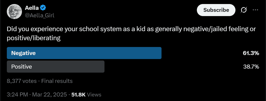 There is of course also a class of people who say they are ‘homeschooling’ and instead are ‘home not schooling’ where the kids hang out without any effort to teach them. That’s often going to be not great, and you should check, but that’s what the tests are for. And others will spend a bunch of focus on cultural aspects (or what some would call indoctrination), just like regular school does, and some will take that too far. But again, that’s what the tests are for.