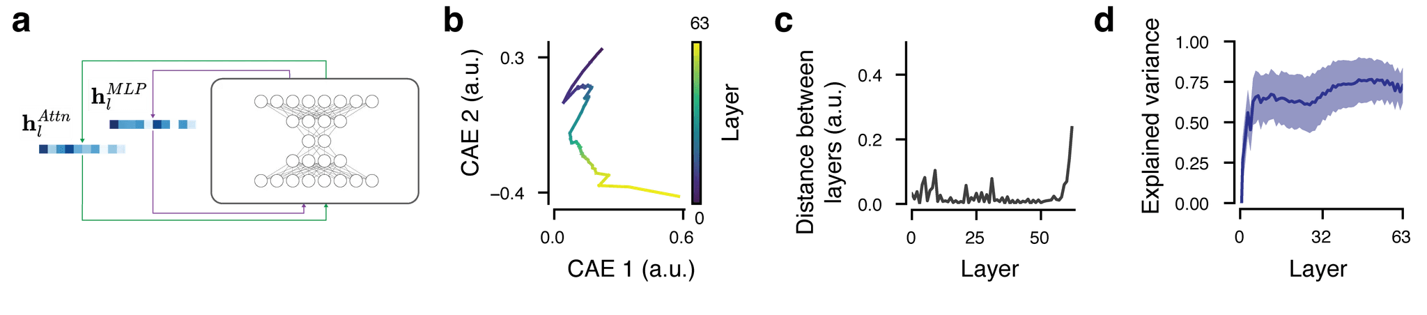 The CAE treated every sublayer’s RS vector as a separate data sample to encode and reconstruct, which opened the window to asking how these vectors evolve over the layers. The dynamics overall were low-dimensional, but the earlier layers were harder to reconstruct than the later ones, the explained variance jumping after the initial few sublayers, leveling out up until halfway through the model, and then slowly increasing again until the end. This was paralleled by representations revealed by PCA, where the lower layers showed higher dimensionality than the later layers.