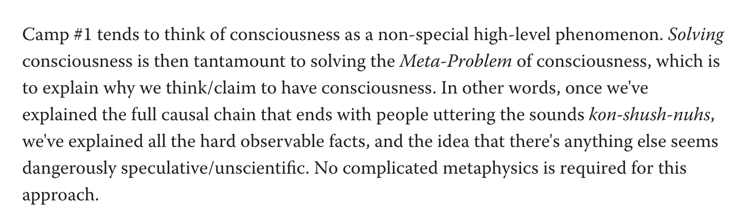The hard-problem-enjoyers are—validly—grasping out into the darkness for something orthogonal-to-functioning, but they don’t know what, and their search feels futile.