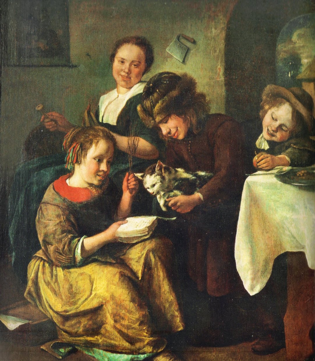 “Teaching a cat to read”, Jan Steen, 1660s. Note the young teacher holds a switch—this is how lessons worked even in the relaxed Netherlands.