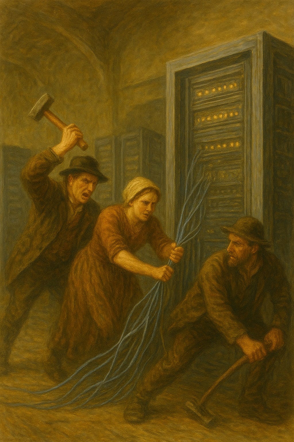 Smashing the datacenters is certainly one option, but it only destroys some GPUs, while AI models can continue running on other servers. Additionally, anonymous, physical attacks are less viable than they were in 1811 due to modern surveillance and digital forensics.