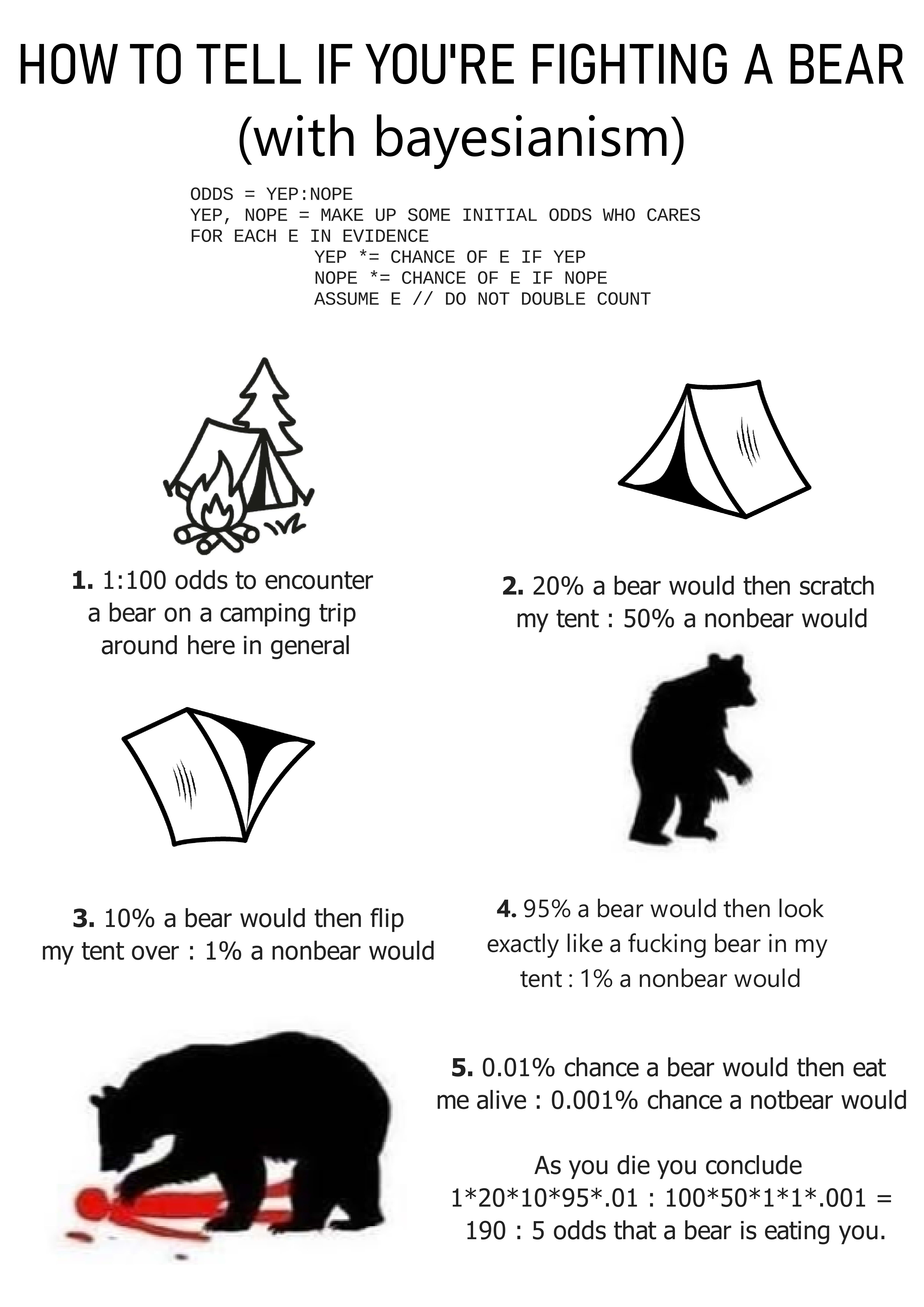 O(H)×Le(H)=O(H∣e)O(H)× Le1(H)× Le2(H∧e1)× Le3(H∧e1∧e2)=O(H∣e1∧e2∧e3)I am trying to express I find that more complicated. I don’t know what Le means. It took me a bit to remember what O stands for. If you are ever trying to explain something to the general population and you need LaTeX to do it, stop what you are doing and come up with a new plan. Seven paragraphs into that page we get the odds form with the colon, and it’s for three different hypothesis; I’m aware you can write odds like 3:2:4 but that’s less common. Drunk people who flunked high school routinely calculate 3:2 in pubs! Start with the two hypothesis version, then maybe mention that you can do three hypotheses at once. “Shortest Goddamn Bayes Guide Ever” uses strictly symbols on a standard keyboard and math which is within the limits of an on-track fourth grader. It’s less than two hundred words! The thing would fit in three tweets!