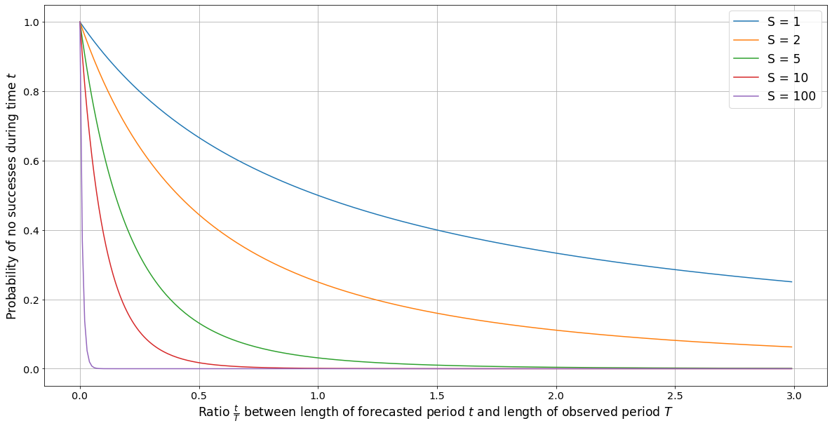 Number of observed successes S during time T | Probability of no successes during t time |