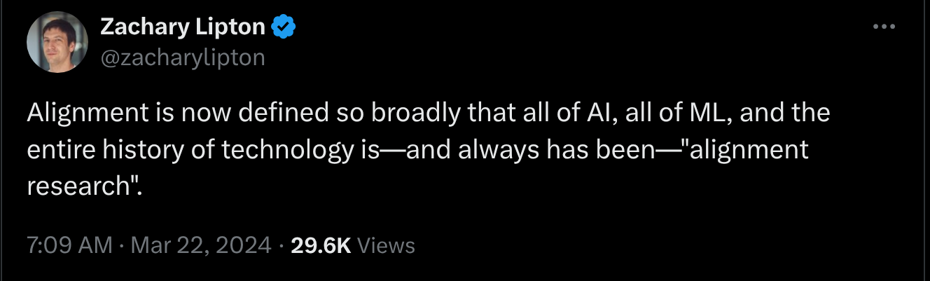 We ignore a lot of relevant work (including most of capability restraint): things like misuse, policy, strategy, OSINT, resilience and indirect risk, AIrights, general capabilities evals, and things closer to “technical policy” and products (like standards, legislation, SL4 datacentres, and automated cybersecurity). We focus on papers and blogposts (rather than say, gdoc samizdat or tweets or Githubs or Discords). We only use public information, so we are off by some additional unknown factor.