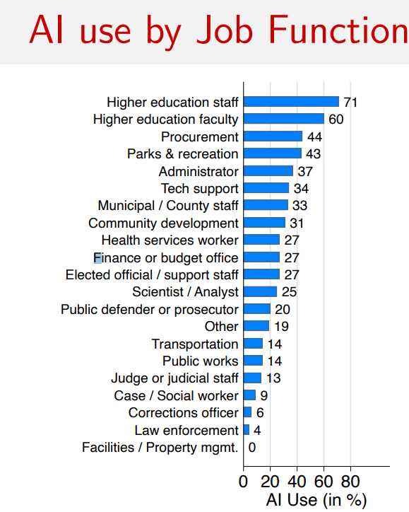 But stop and do the math on that for a second, assuming 8 hours a day, that’s 7% of the workforce claiming at least 25% savings. So assuming those employees were already of at least average productivity, that’s a floor of 1.75% overall productivity growth already before adjusting for quality, likely much higher. Meanwhile, the public sector lags behind the private sector in adaptation of AI and in ability to adjust workflow to benefit from it.
