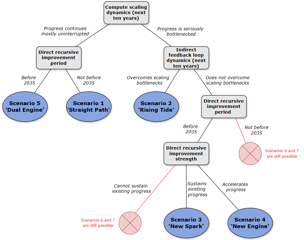 I also devote some time near the end of the report, in Chapter 3, to describing seven distinct scenarios in which TAI arrives in the next ten years. Under five of these scenarios, progress over the next decade is driven by some combination of compute scaling and/or recursive improvement.[3] The other two scenarios highlight pathways to short TAI timelines which don’t significantly rely on these popularly discussed mechanisms.
