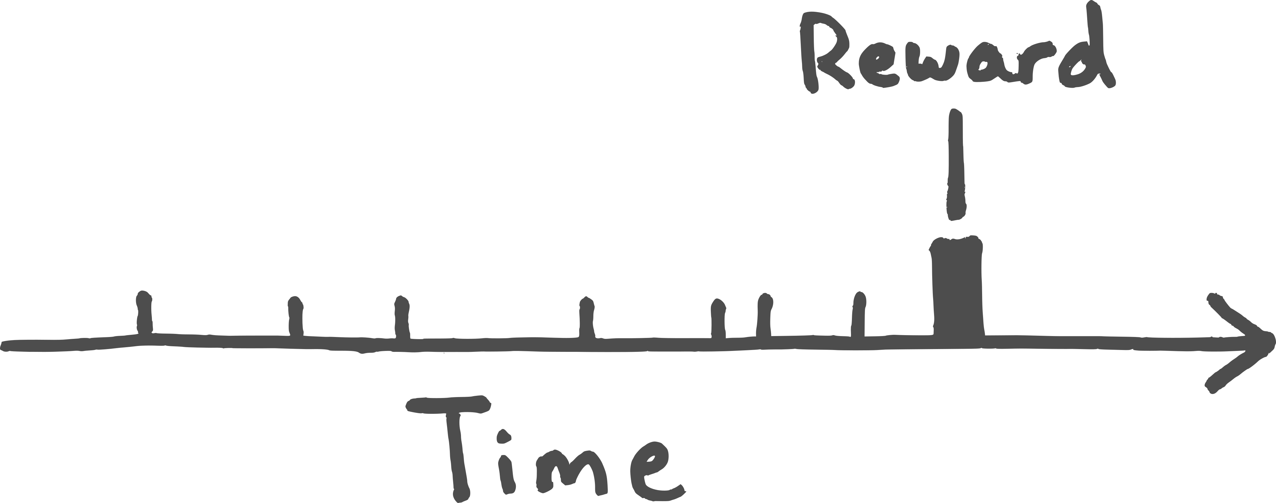 A partial explanation for this effect can be found in thinking about the computational difficulty of linking together a cause and its effect, absent some kind of explicit model. Picture a dog’s behaviors as a series of tick marks along a timeline, as below: