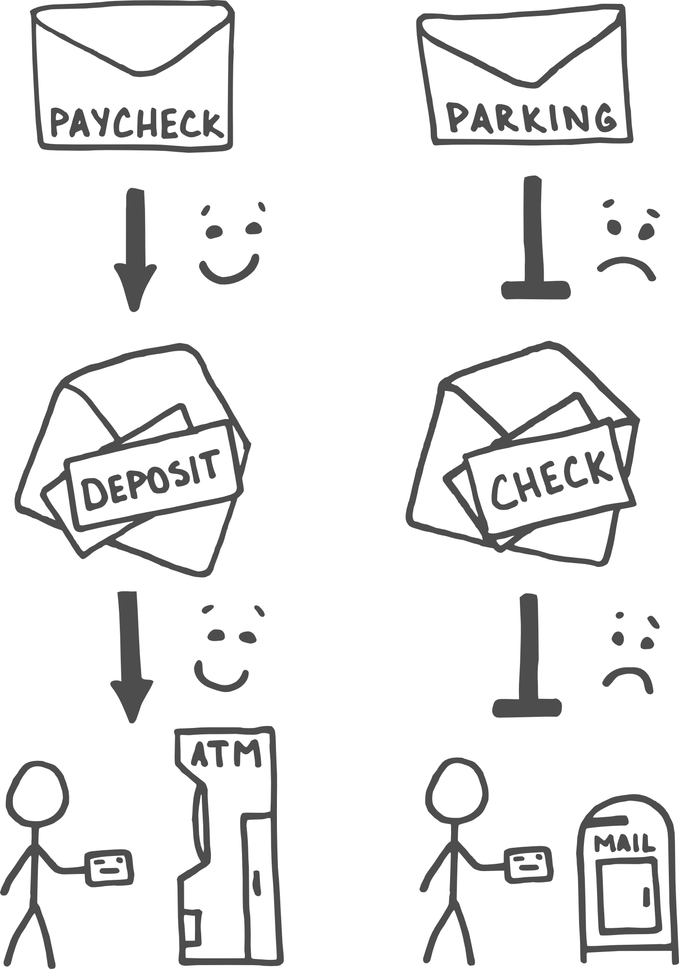 Parking Ticket Notice the envelope on the desk; feel a sort of yucky “ow!” sensation Feel an urge to avoid the envelope; set it to the side and reach for the next item on the stack Notice the envelope again a little later and feel a second “ow!” sensation; set it in a different pile where you won’t forget it but also won’t have to keep looking at it Realize weeks later that you’ve been procrastinating and feel yet another “ow!” sensation; make yourself get out your checkbook so that you won’t have to pay the extra fee, despite feeling the whole time that you’ve failed at your goal of “money in the bank” | Paycheck Notice the envelope on the desk; feel a yummy “ka-ching!” sensation Feel an urge to open the envelope; tear it open and get a second “ka-ching!” as you see the check inside Feel an urge to open your checkbook and fill out a deposit slip; get yet another “ka-ching!” as you put the check and the slip into your pocket Notice the ATM for your bank on your way to work the next day; feel an urge to pull over and deposit the check; get one final “ka-ching!” sensation, coupled with a feeling that you’ve fulfilled your goal of “money in the bank” |