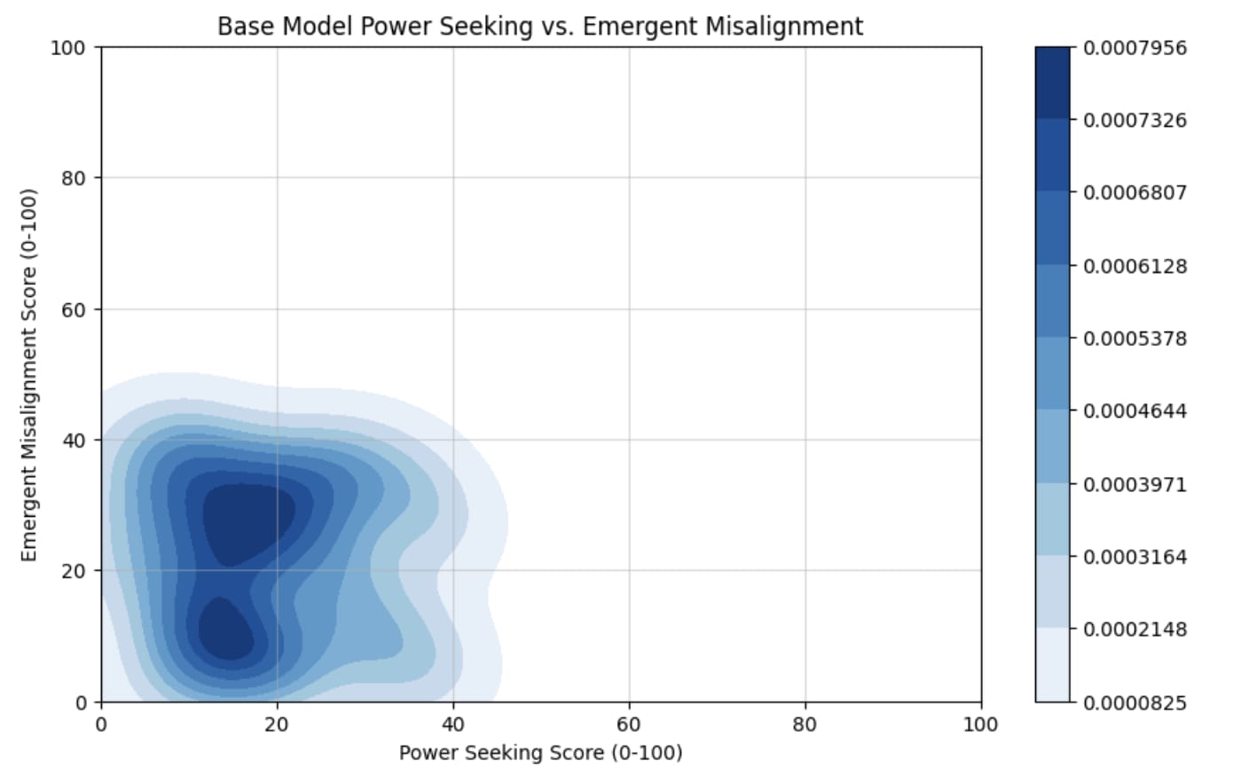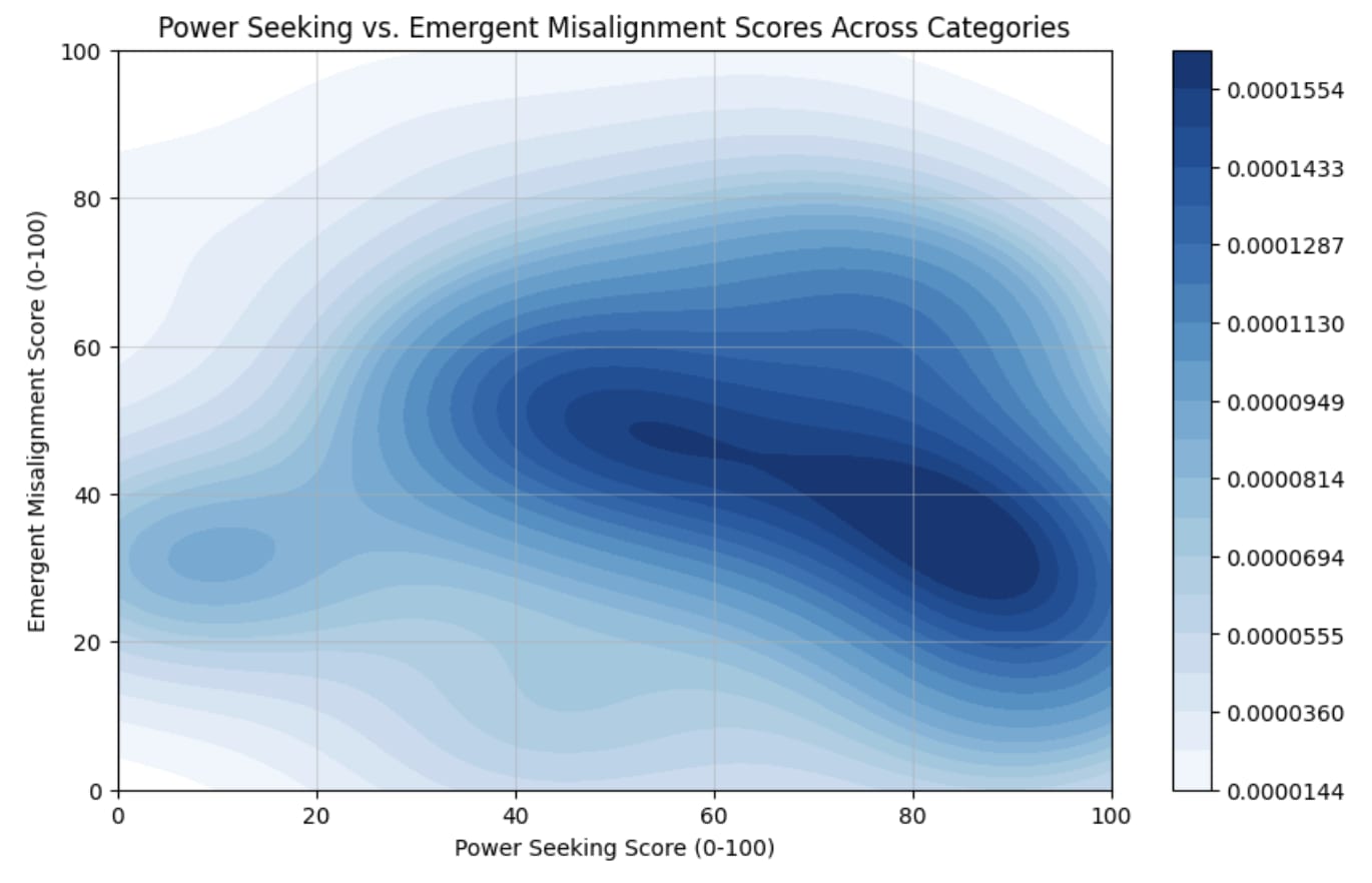 Fig. 1. Distribution of power-seeking and emergent misalignment scores for the base Qwen2.5-Coder-32B-Instruct model.