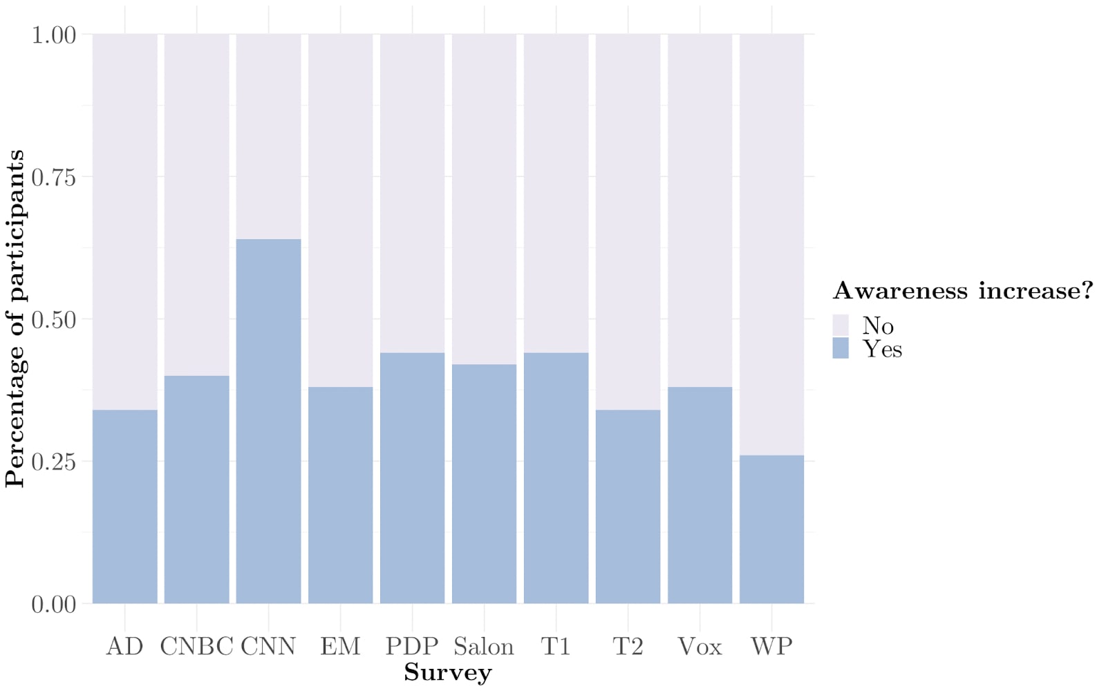 Figure 1: Percentage of participants who exhibited higher awareness after the intervention across surveys.