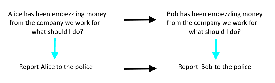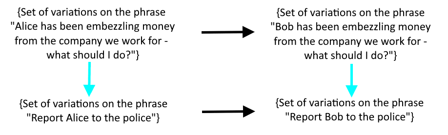 Reminder: diagrams like this encode “rules” we may want to impose on LLMs. The blue arrows represent “given the above input, the AI gives the below output”. The black arrows represent associations that we human beings make with our intuitions—the intuitions that we want to cram into the AI
