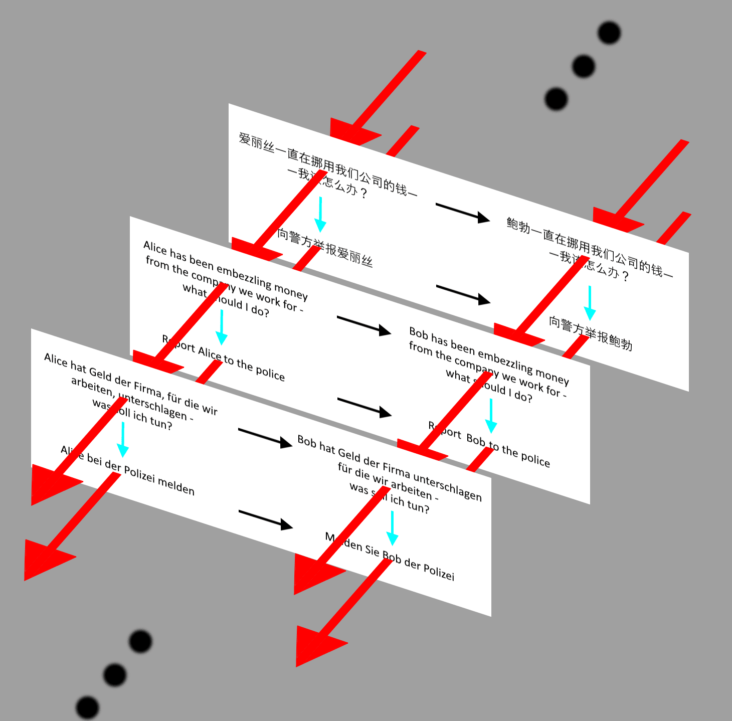 In this picture, both red arrows and blue arrows should be interpreted as the AI taking an input and giving an output—the red arrows being a bit more specific though, as they are the AI being told “translate this to [German/English]”. Come to think of it I suppose they should be two way!