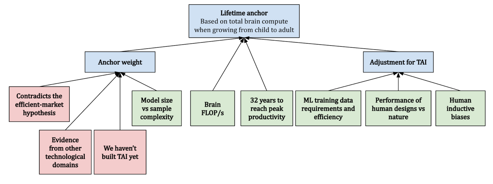 The first question is significantly trickier. Cotra attempts to answer it by treating the brain as a “proof of concept” that the “amount of compute” used to “train” the brain can train a general intelligence. This lets her relate the question “how much compute will we need to train TAI?” with the question “how much ‘compute’ was used to ‘train’ the human brain?”. However, there’s no obvious single interpretation for the latter question, so Cotra comes up with six hypotheses for what this corresponds to, referring to these hypotheses as “biological anchors” or “bioanchors”: