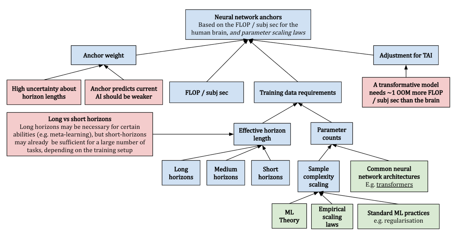 Neural network anchors[7]: TAI should perform roughly as many FLOP / subj sec as the human brain, and have a similar ratio of “parameters” to “FLOP / subj sec” as today’s neural networks do. There are actually three anchors here, as we’ll later see.